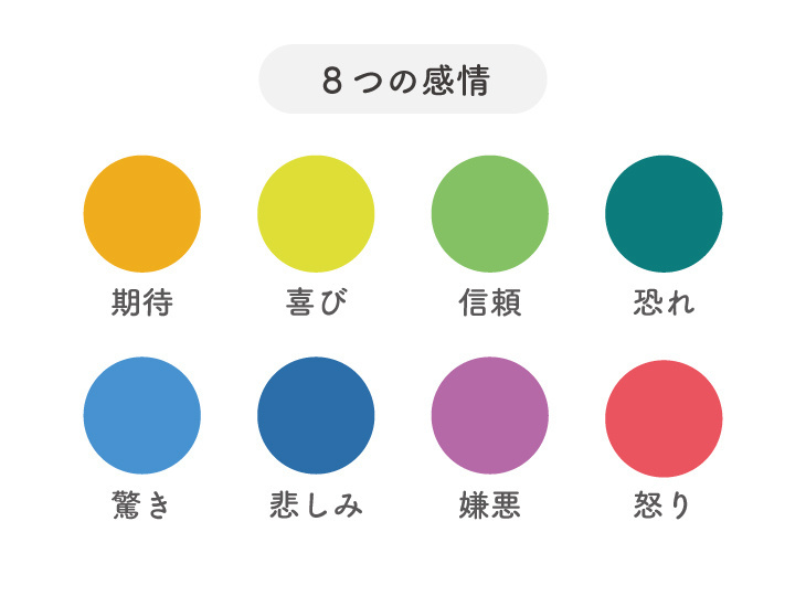 基本感情を表す8色のきもちを中心に、様々なきもちのニュアンスをオノマトペとして抽出しました。