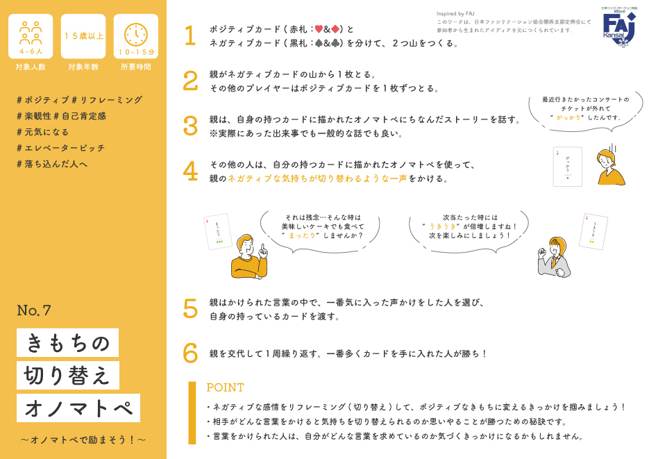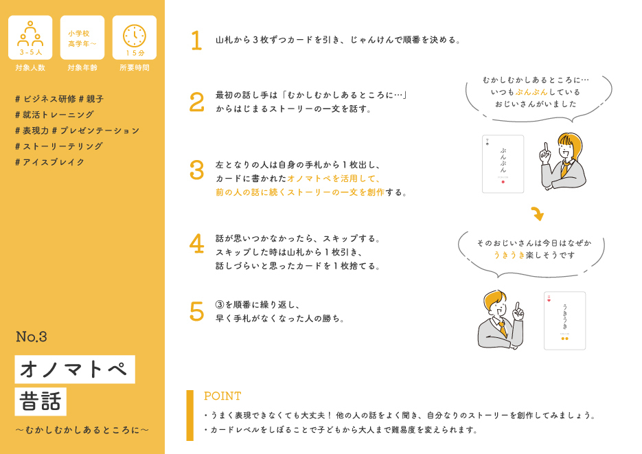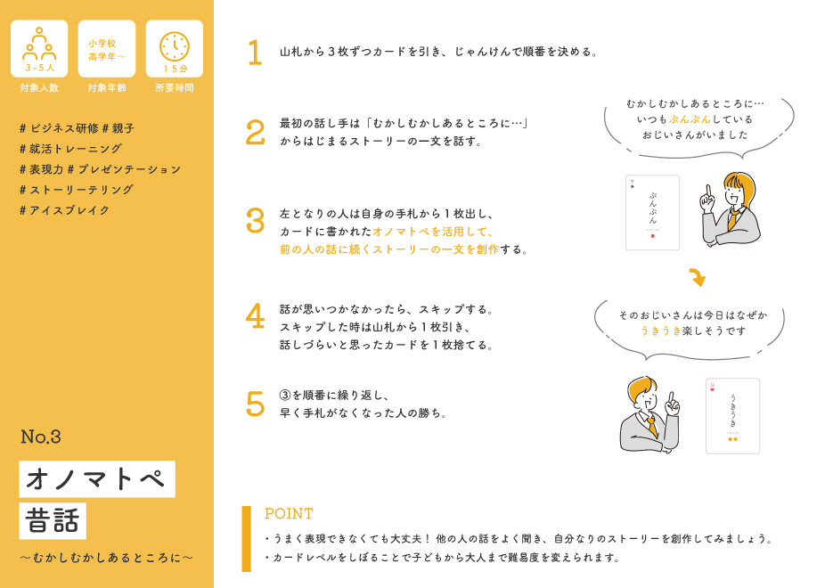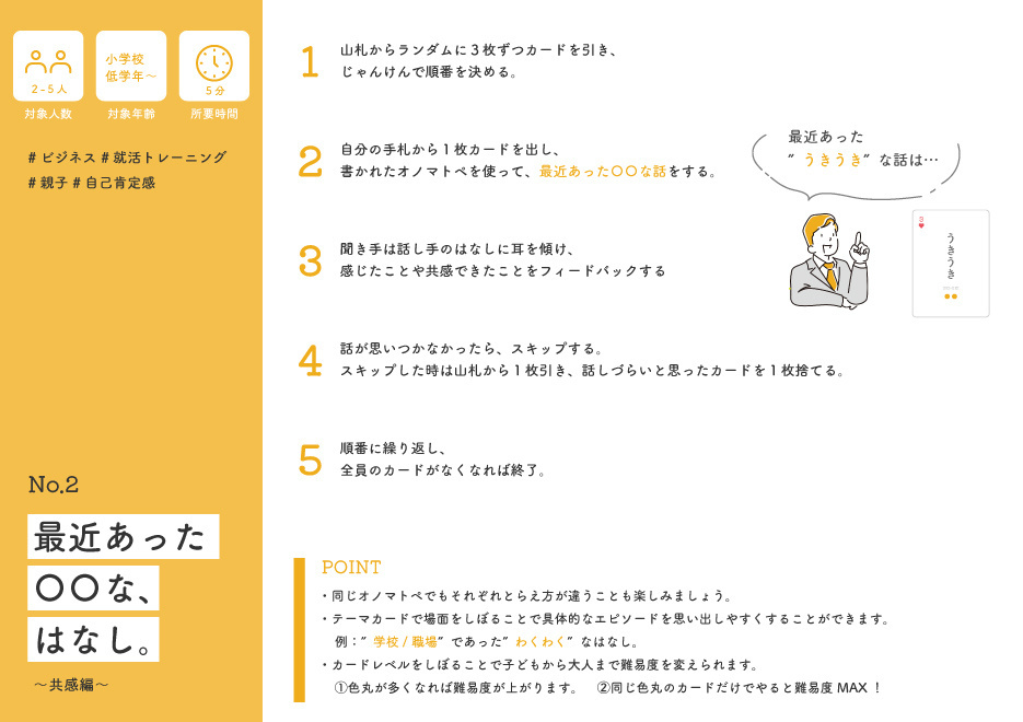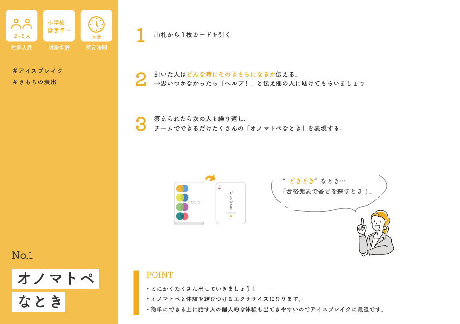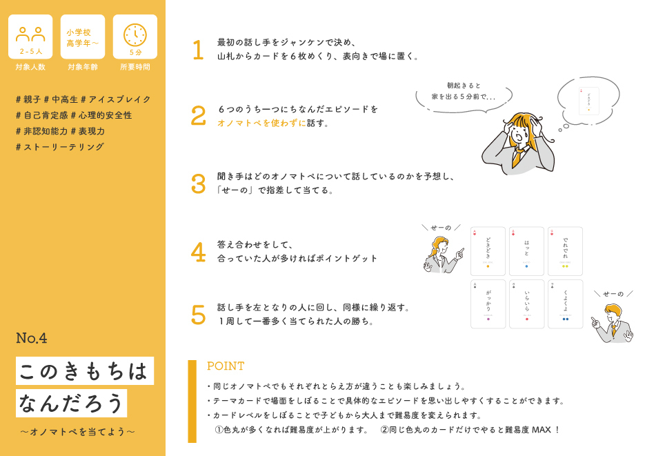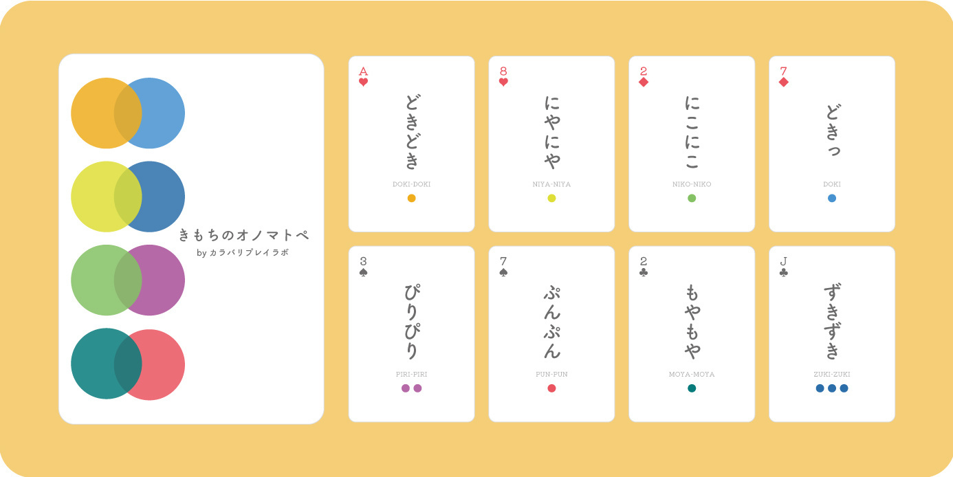 感情を表すオノマトペを活用した対話を通じて、 普段言葉にしていない自身の気持ちと向き合い、 自己理解と相互理解を深めるためのカードゲームツールです。